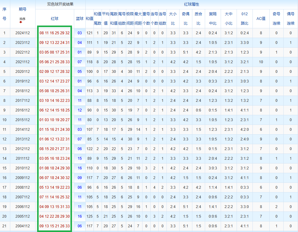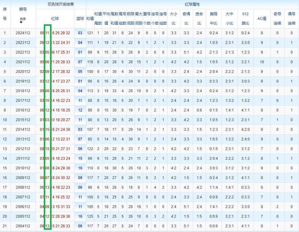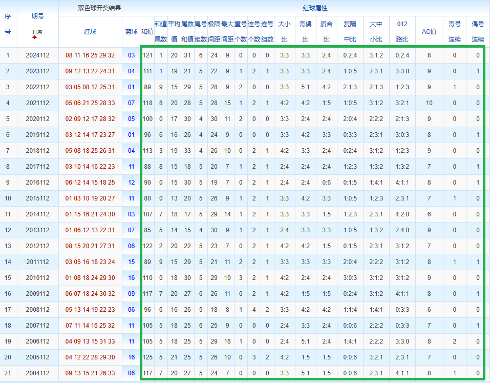 通过观察,我发现双色球往年同期的开奖数据与本期号码之间存在显著关联。具体来说,在红球中,从第一位至第六位,通常会有约4个位置上的数字与往年同期相同位置的号码一致;而蓝球号码中,也有多期开奖结果直接包含了往年同期的数字。因此,我们可以借助往年同期各位置上的号码,作为分析本期开奖情况的重要依据。在此基础上,还可结合往年同期的其他相关条件,进行综合性的号码组合推荐。