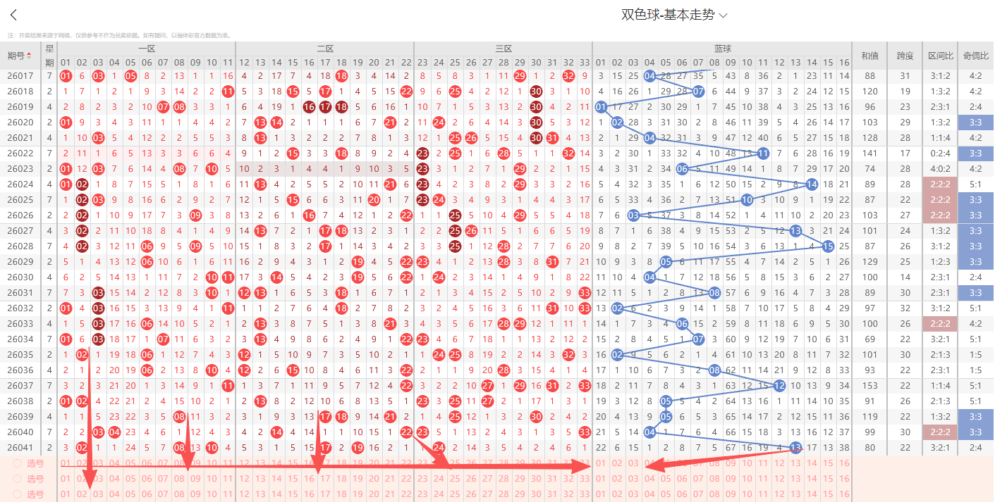 1、红球特征分析:(通过整体走势不难看出每期开奖号都具备以下明显的特征点)