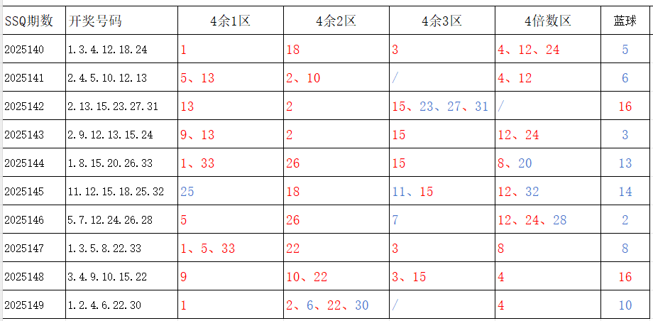 分享第一个数据分析:四分区统计数据。相对于传统的三分区,个人习惯使用四分区,就是把33个红球号码除以4,所得的余数分区如下: