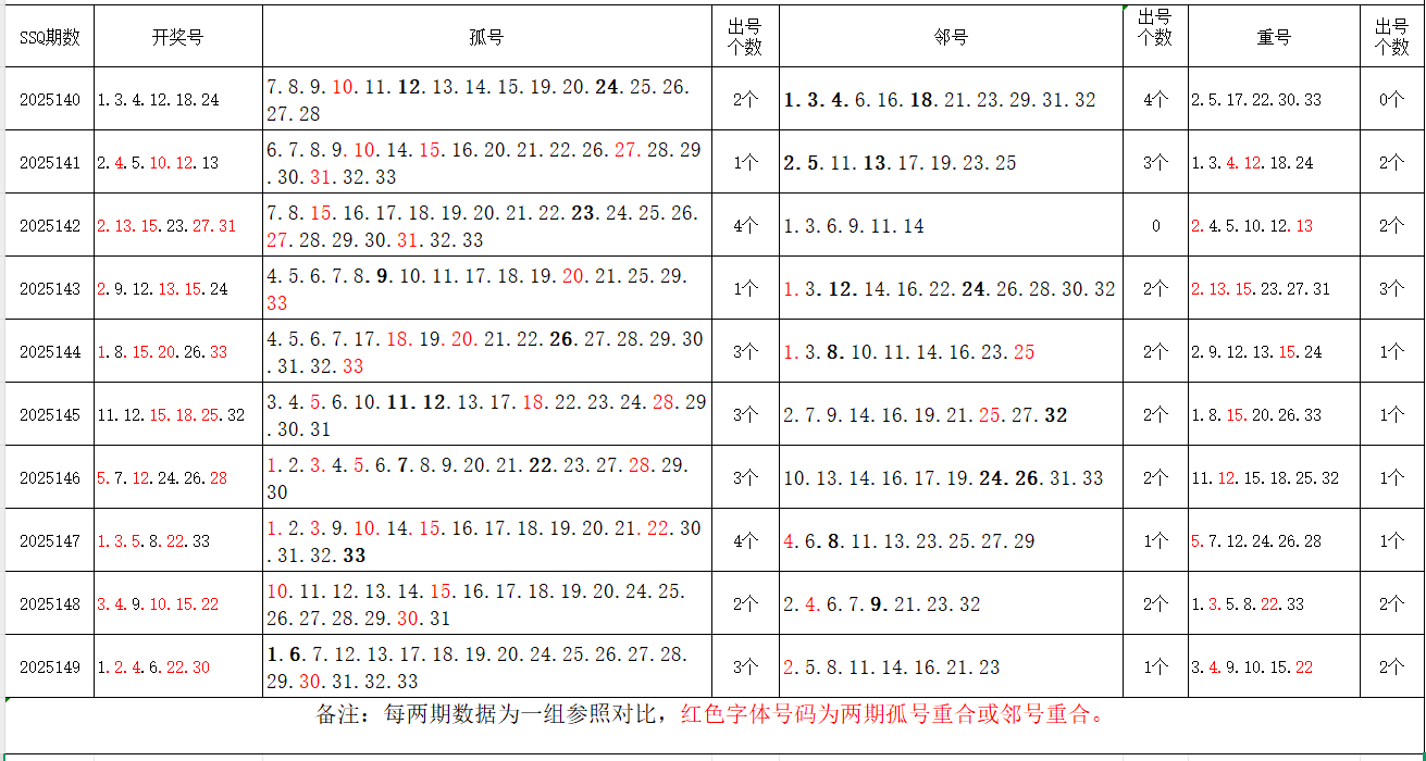 如图,以近两期数据为一组,进行对比分析。相同的孤号、邻号,可能在下期出1-4个左右。上期开出孤号3个,邻号1个,重号2个。本期参考孤号:8.9.10.11.12.13.14.15.16.17.18.19.20.24.25.26.27.28.32.33;邻号:3.5.7.21.23.29.31;孤、邻号重合号码精选:***(会员专区可见)。个人分析,仅供参考。