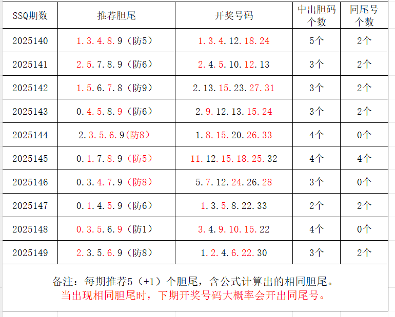 如图,每期推荐胆尾中出1-4个。上期推荐胆尾中出2尾3码!推荐胆尾是按照公式计算的顺序,不定位红球号码的顺序。本期推荐胆尾:8尾/4尾/5尾/6尾/2尾  。加推重点胆尾:***(会员专区可见)。推荐胆码号码:***(会员专区可见)。个人分析,仅供参考。