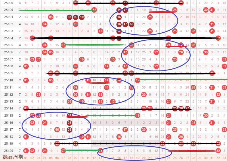 如图所示:体现的是3个局部走势的发展周期,圆圈为密集处的填空,本期定性为新局部走势3期,主力填空期,修饰真实目的空间期,代表1区号码低开部分需要小于等于5出首码,反之高开修饰绿色的线。红色的线放大造成本期蛋跨强补4-5枚号码。