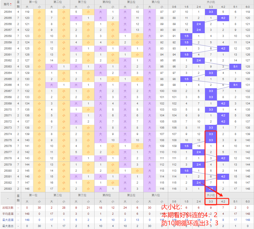 上期大小比:3:3,近10期大小比出现情况:3:3、3:3、1:5、2:4、4:2、2:4、1:5、4:2、2:4、3:3,最近10期出现2期3:3,出现3期4:2,出3期2:4,出现0期5:1,出现2期1:5,出现0期6:0,出现0期0:6,根据近10期规律本期看好斜连的4:2,防10期循环连出3:3,综上所述推荐大小比推荐:3:3,重点关注:4:2。