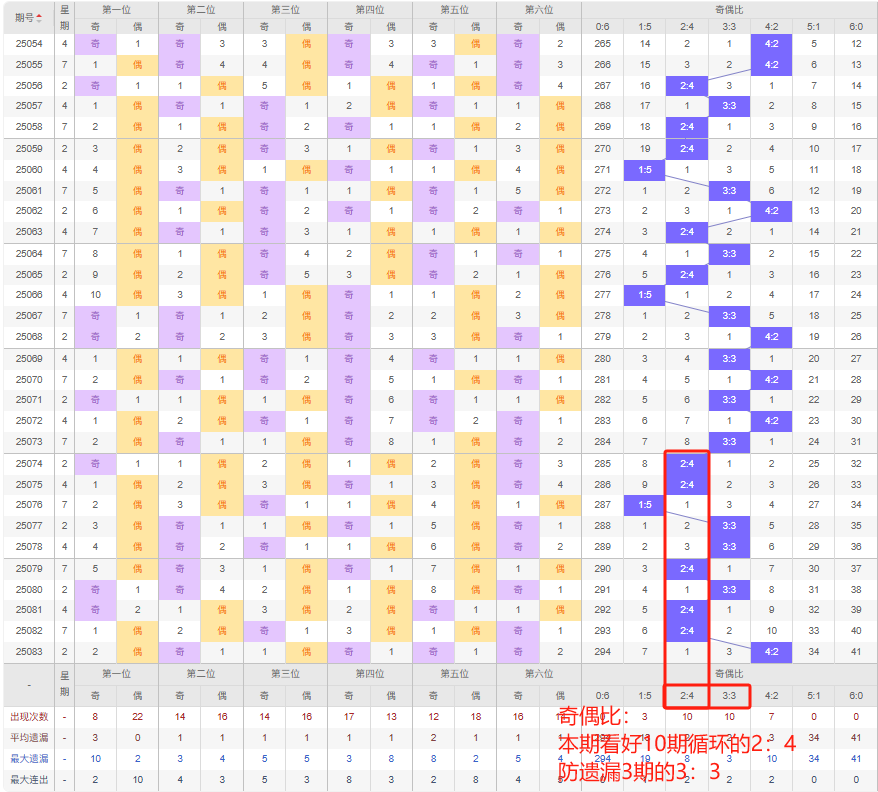 上期奇偶比:4:2,近10期奇偶比出现情况:2:4、2:4、1:5、3:3、3:3、2:4、3:3、2:4、2:4、4:2,最近10期出现4期3:3,出现1期4:2,出现5期2:4,出现0期5:1,出现1期1:5,出现0期6:0,出现0期0:6,根据近10期规律本期看好10期循环的2:4,防遗漏3期的3:3,综上所述推荐奇偶比推荐:3:3,重点关注:2:4。