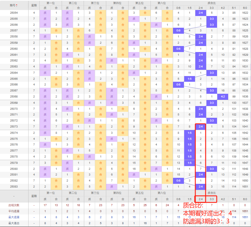 上期质合比:2:4,近10期质合比出现情况:1:5、1:5、1:5、1:5、1:5、1:5、3:3、2:4、0:6、2:4,最近10期出1期3:3,出现0期4:2,出现2期2:4,出现0期5:1,出现6期1:5,出现0期6:0,出现1期0:6,根据近10期规律本期看好连出2:4,防遗漏3期的3:3,综上所述推荐质合比推荐:3:3,重点关注:2:4。