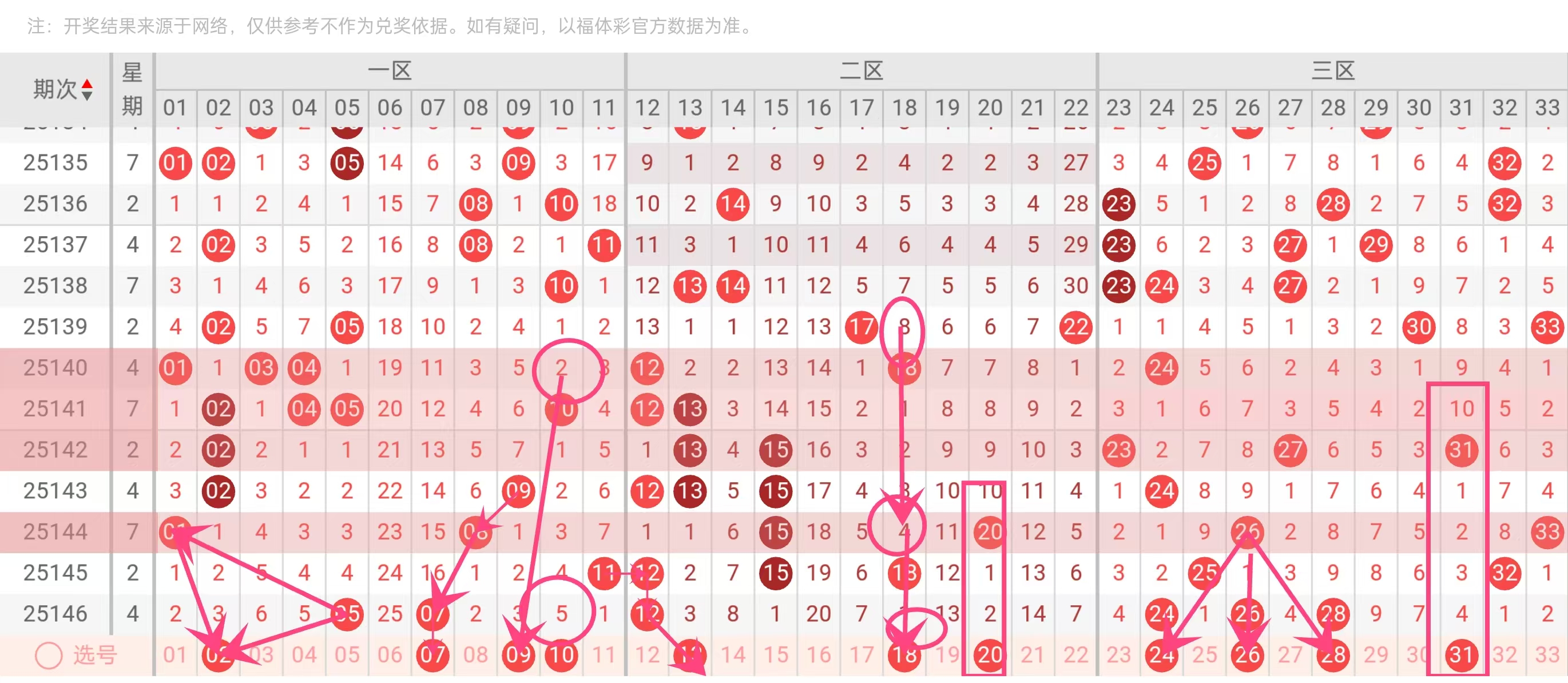 红球33:近期连续出现后已趋于饱和,短期内难复现。