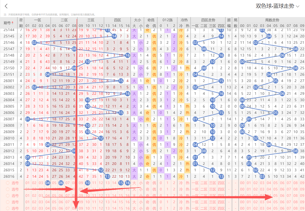 上期开出大号奇数13,从走势上号码整体分布结合折线运行轨迹本期蓝球重点关注五码04 06 10 15 16参考。有关更多详细选号思路以及号码组合搭配 我们15:00~17:30点有选号思路详细解析的直播节目欢迎大家前来一起探讨交流。
