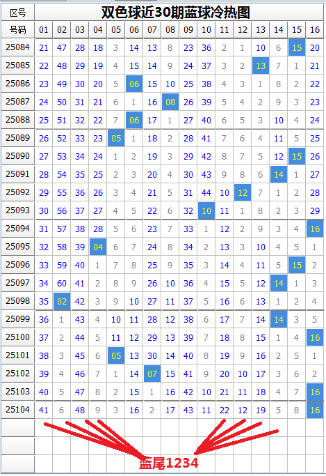 蓝球本期有热蓝7枚,冷蓝9枚,蓝球冷码数量稍多。上期开出热蓝,这是连续两期开出,由于近期蓝球冷热交替开出规律不明显,本期蓝球冷热难定。