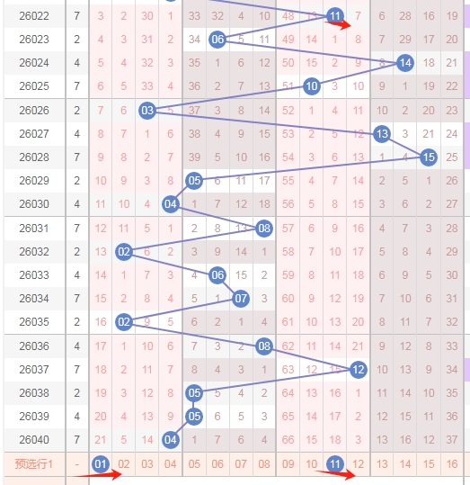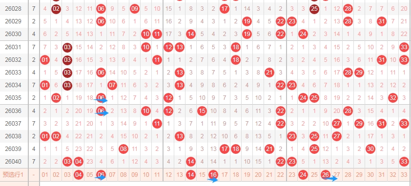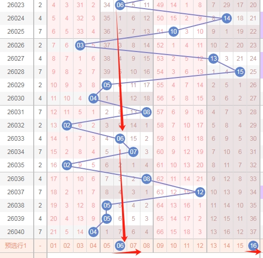 上图是福彩双色球红球号码走势分布图,我标注出来的数字是6尾数数字,看蓝色小箭头,已经连续遗漏了4期,那么本期出6尾数红球号码的机会是有的,关注6尾数的数字06 16 26出一个或者两个,那么可以搭配4尾数的数字一起出现,刚好4尾数数字最近十期出号码也不多,那么这样的话,要小心一下连号组合0406 1416 2426出一组。