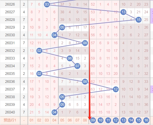 上图是福彩双色球蓝球开奖号码走势分布图,我标注出来的红色箭头右边的数字很明显最近十几期出号码不多,最近又连续三期出现的蓝球都在红色箭头左边的区域,那么本期可以关注红色箭头右边的数字,那么就是蓝球范围09 10 11 12 13 14 15 16。