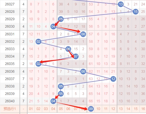 上图是福彩双色球蓝球开奖号码走势分布图,我标注出来的红色箭头看看,假设蓝球出蓝球09,那么你们看看红色箭头,这些箭头是不是很相似呢?上面蓝球05 04后面走蓝球08,还有上面蓝球06 07后走蓝球02,这两个图形对比一下。