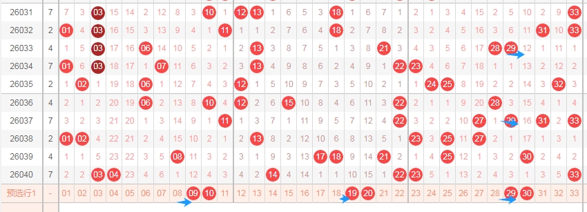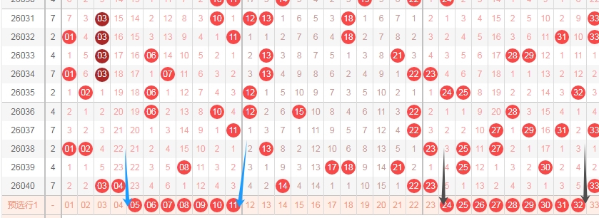上图是福彩双色球红球号码走势分布图,我标注出来的蓝色箭头中间这个区域的数字05 06 07 08 09 10 11一共有数字7个。上期一个数字没出现,最近几期出号码也不多,那么本期这个区域的数字可以关注出号码2个或者3个吧,同样的看黑色箭头中间这个区域的数字24 25 26 27 28 29 30 31 32一共有9个数字,上期是一个数字没出现,那么本期这个区域的数字可以关注出2个或者3个吧。