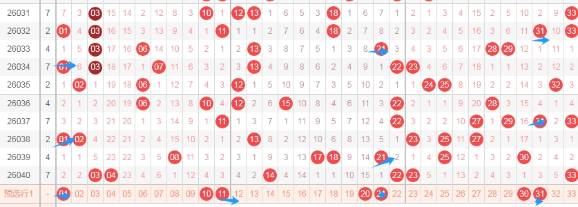 上图是福彩双色球红球号码走势分布图,我标注出来的数字是1尾数数字,看蓝色小箭头,近期出号码不多,那么本期出1尾数红球号码的机会是有的,关注1尾数的数字01 11 21 31出一个或者两个,那么可以搭配0尾数的数字一起出现,刚好0尾数数字最近出号码也不多,那么这样的话,要小心一下连号组合1011 2021 3031出一组。
