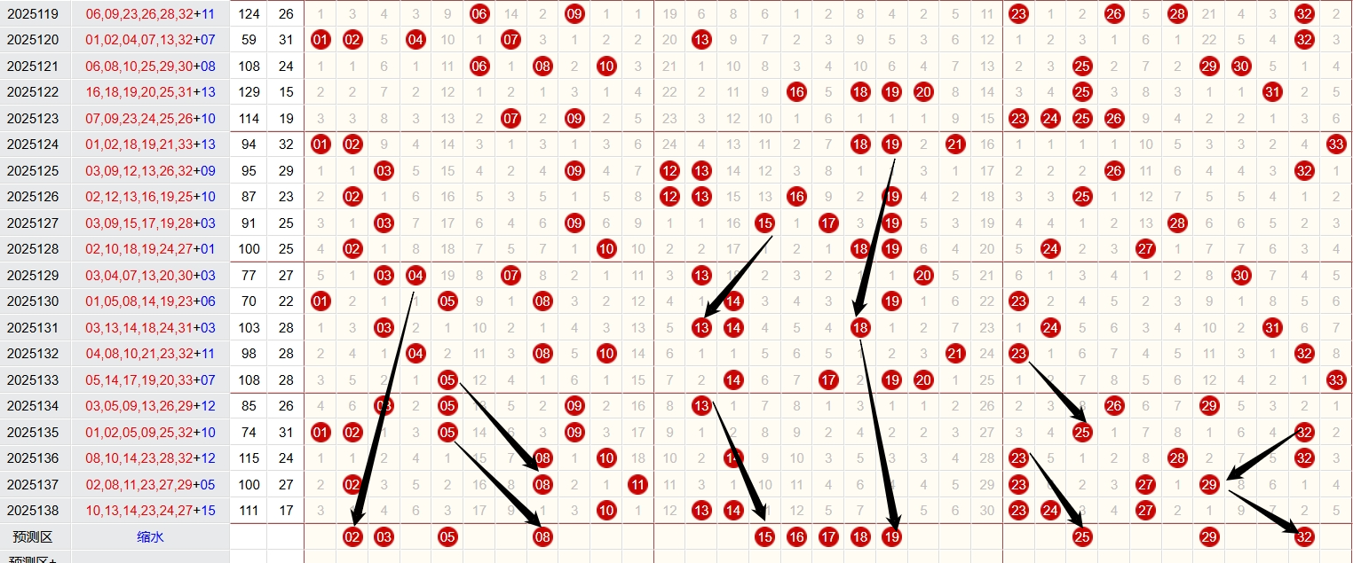 回顾上期25138期开奖10 13 14 23 24 27 + 15 ,其中一小区01-11出1个,二小区12-22出2个号,三小区23-33出3个!