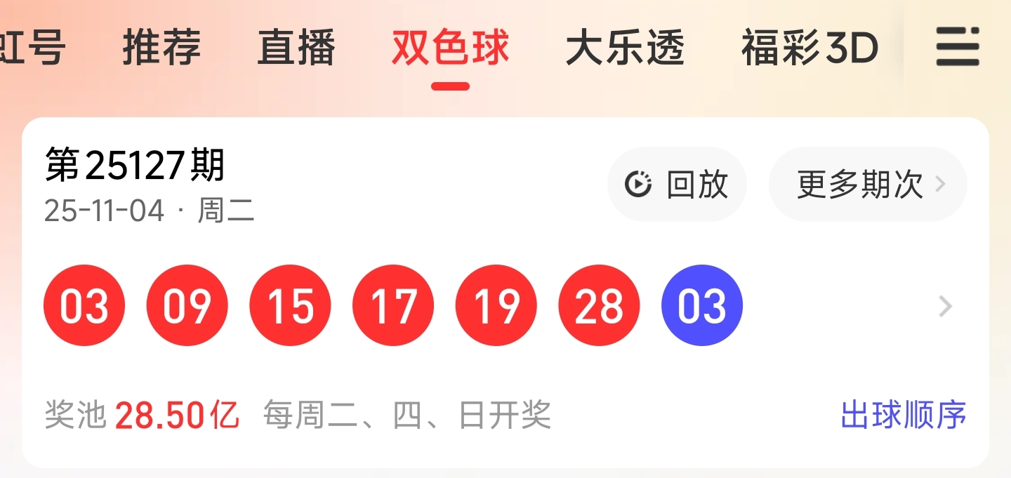 红球开出3,9,15,17,19,28。蓝球开出3。