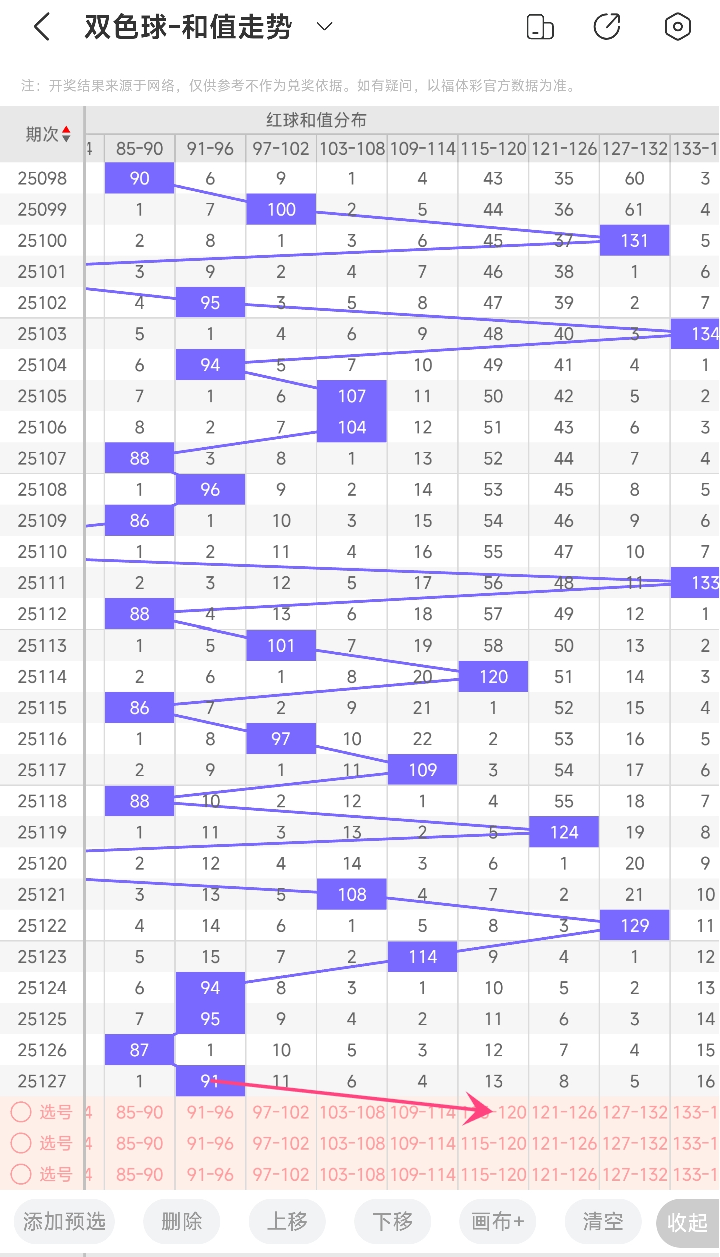 上期和值为91,而近5期和值为114,94,95,87,91均值96.2,上期和值较前一期增加了4,振幅为4。91和值是属于近30期内开出的比较小的和值,下降的空间比较小,上升的空间很大。所以推测本期和值趋势是大概率往右,和值变大,小概率往左,和值变小。