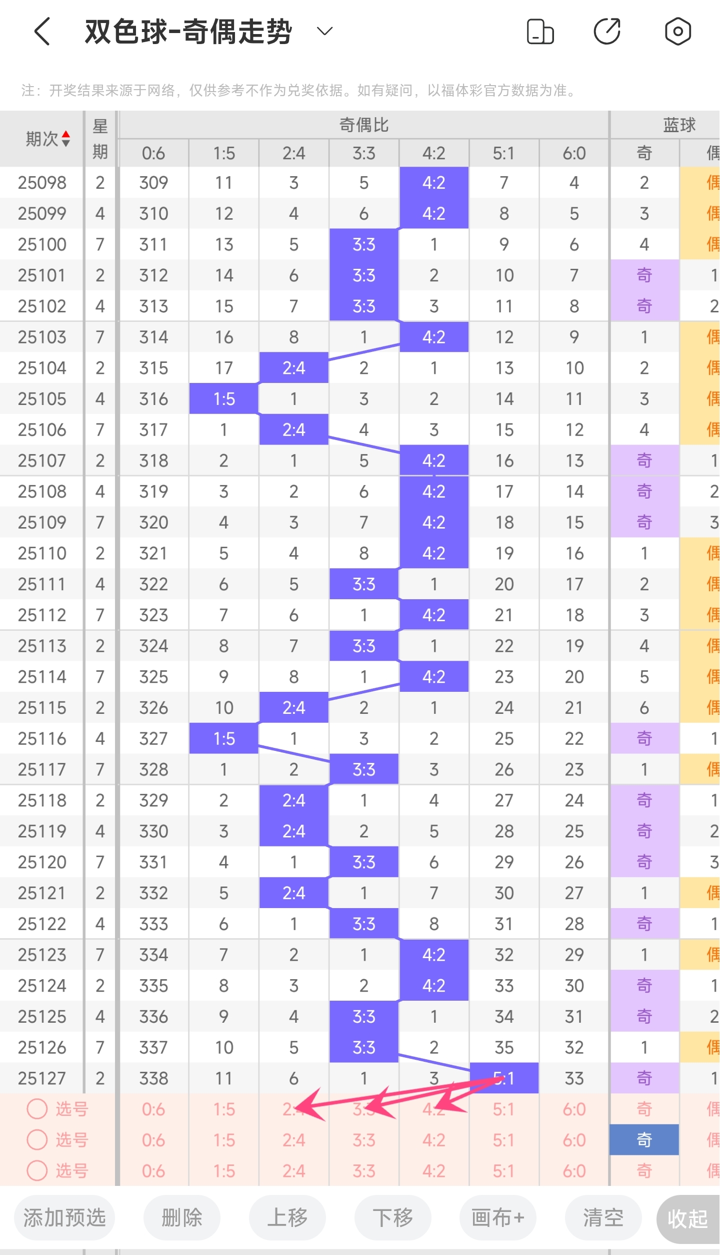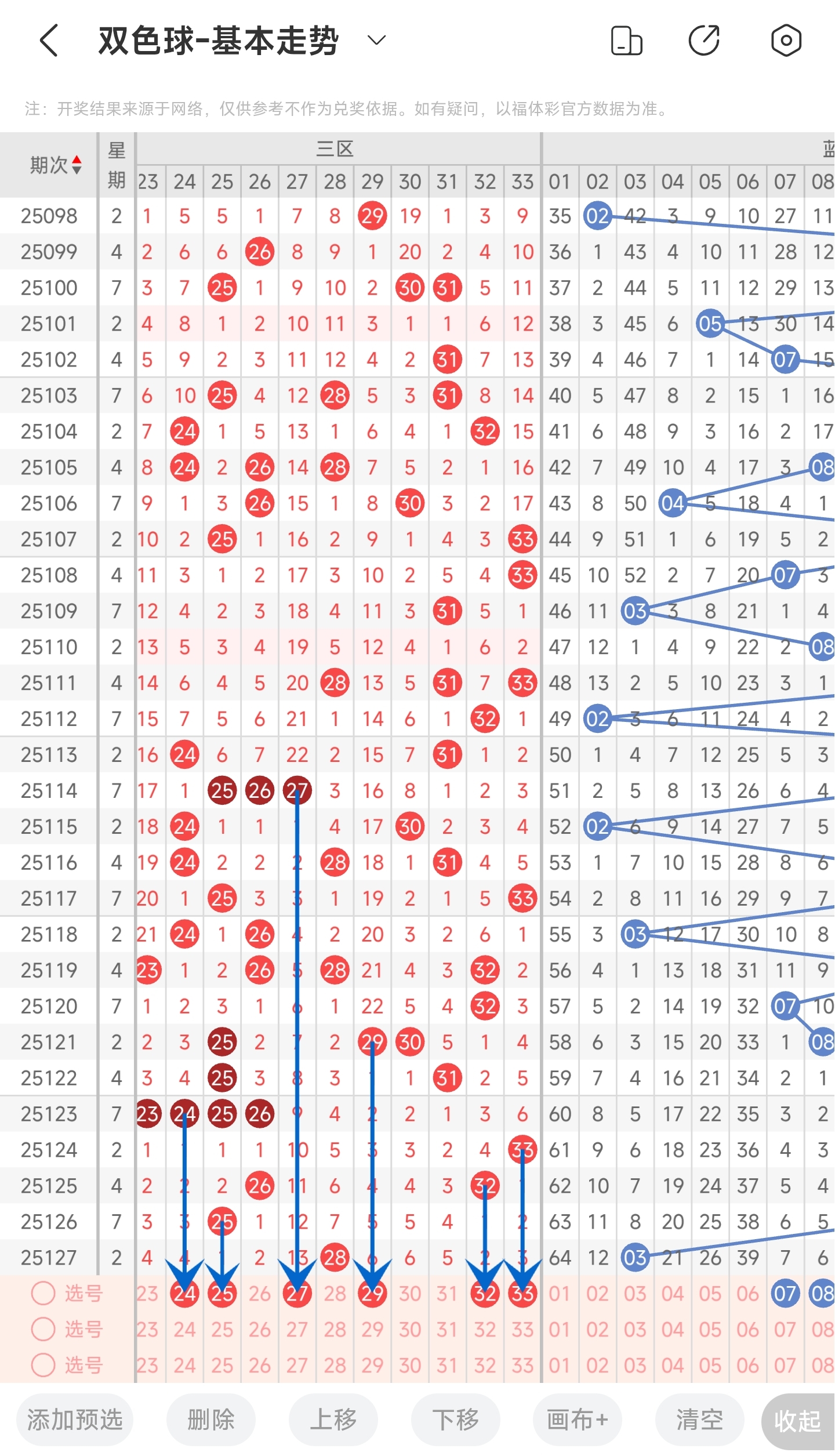 上一期三区开出了28号球。往前一期出了25号球。通过走势图分析,可以看到近几期三区比较冷门,开出的都是一个号码,本期推测继续保持。上期凤尾开在了中间,本期看好左边和右边。可以重点关注一下。最后再结合冷热号和遗漏期数,本期我们可以关注24,25,27,29,32,33等号。综上所述本期我们推测有可能开出24,25,27,29,32,33等号码。