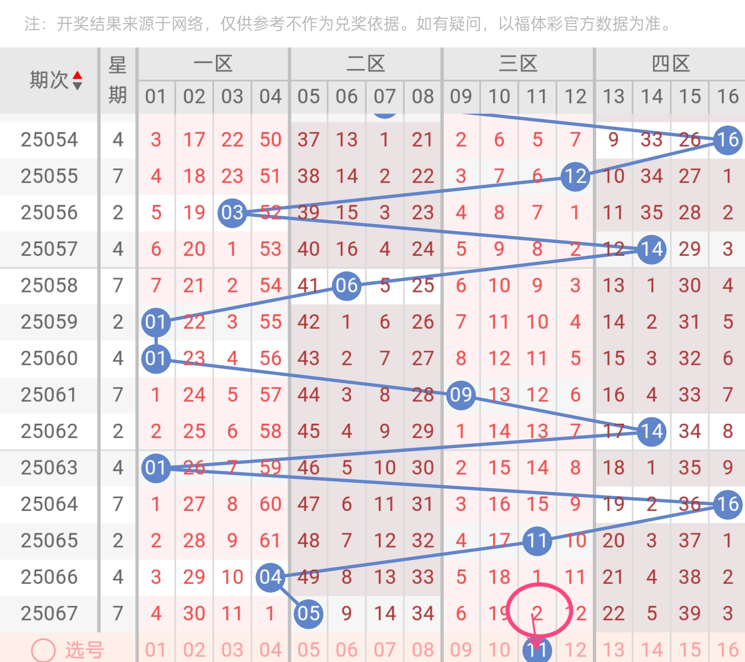 - 01(一区首号):一区过热但首尾分化,01成"灯下黑"(近20期仅出1次)。当小号密集时(如上期5小号),首号概率反降至3%(统计100期)