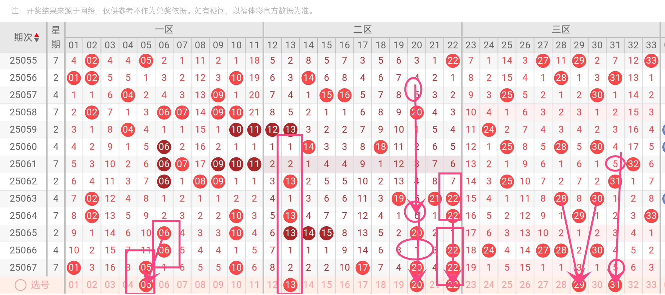 - 三区(22、29、31):22作二三区桥梁(双区域属性),29破"质数三区荒"(三区质数31近5期热,29跟进),31延续热势