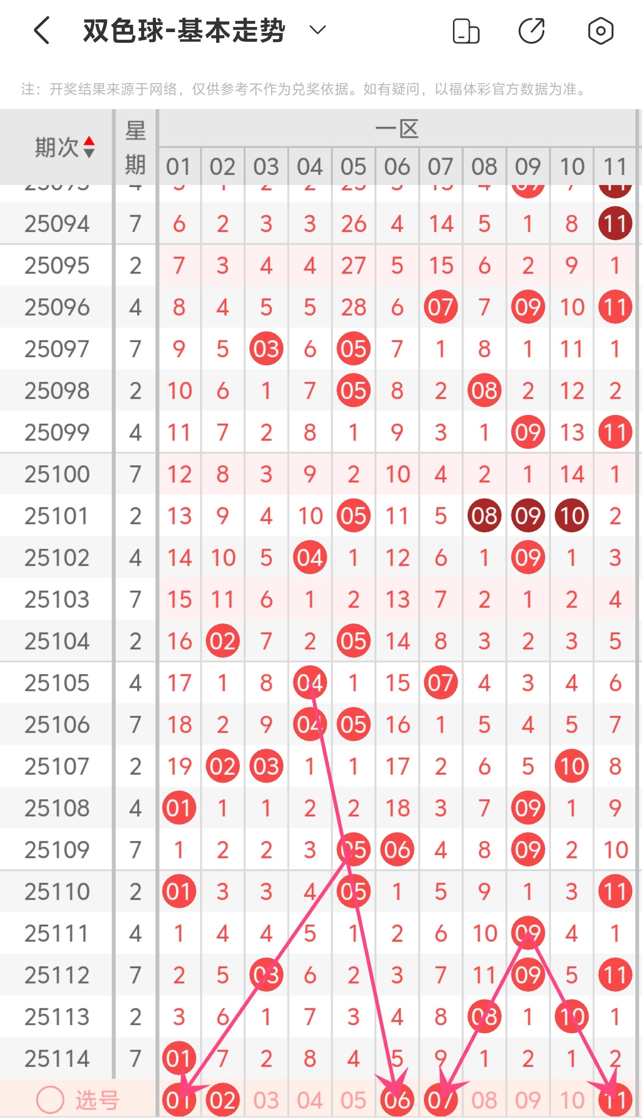 下面双色球的第一区间走势图分析: