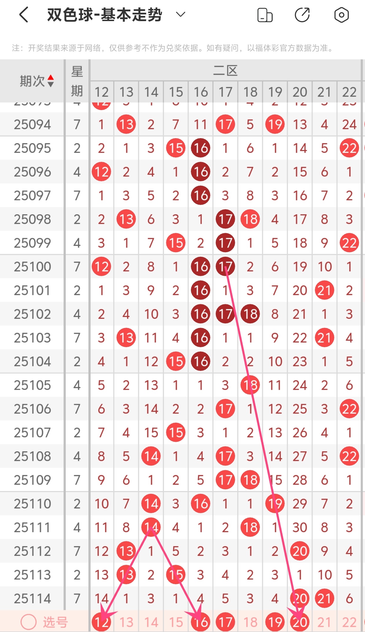 上期第二区间开出20 21,本期我们可以从上面走势图中看到选号的思路,12为斜连走势,16为斜连走势,20为斜连走势,综合以上分析本期第二区间推荐12 16 17 19 20
