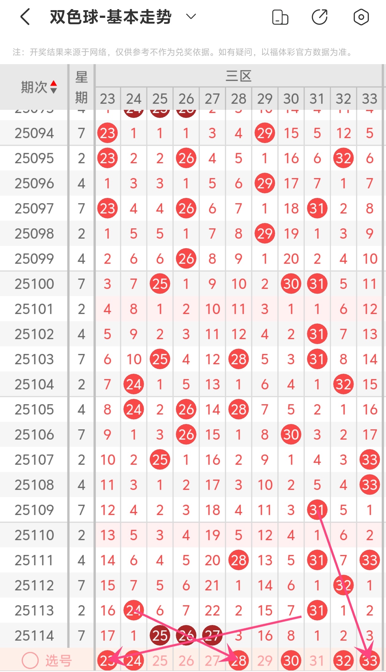 上期第三区间开出25 26 27,本期我们可以从上面走势图中看到选号的思路,23为斜连走势,28为斜连走势,33为斜连走势,综合以上分析本期第三区间推荐23 24 28 30 32 33