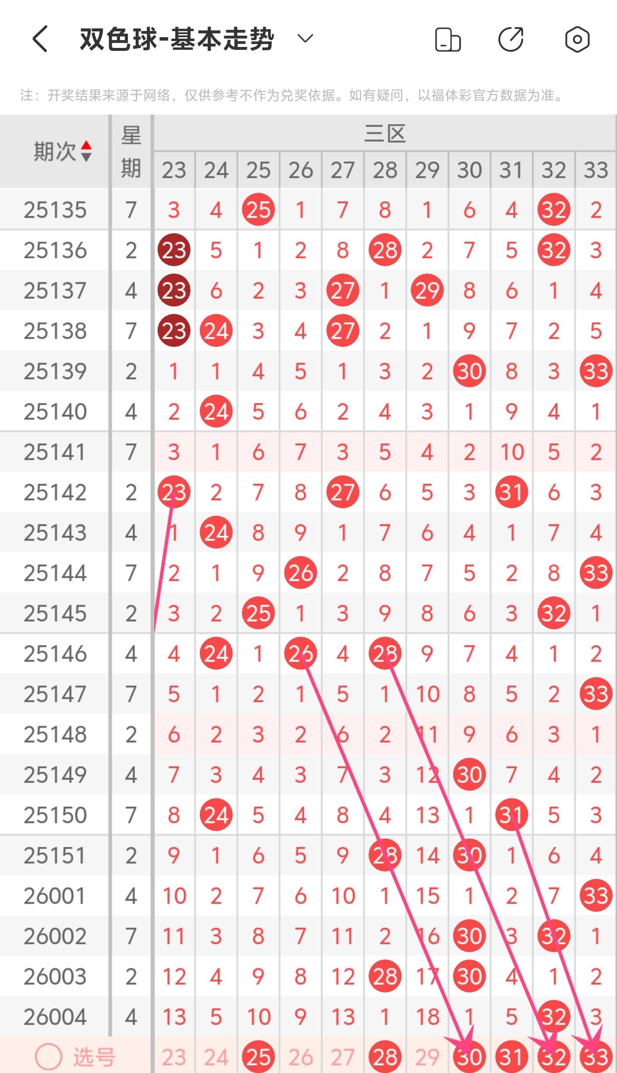 上期第三区间开出32,本期我们可以从上面走势图中看到选号的思路,30为斜连走势,32为重码带斜连走势,33为斜连走势,综合以上分析本期第三区间推荐25 28 31 32 33