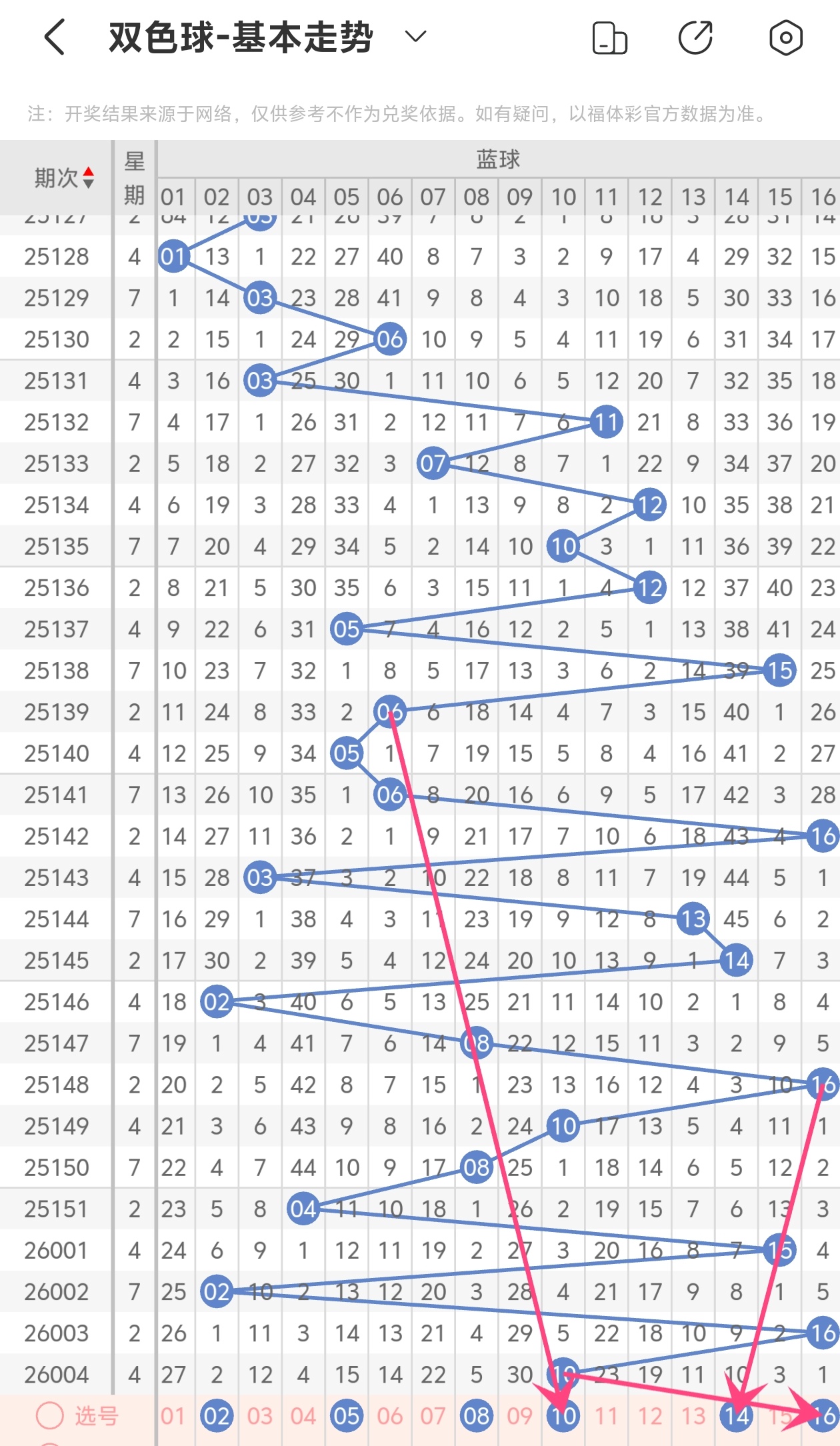 上期蓝球开出10,本期我们可以从上面走势图中看到选号的思路,10为斜连走势,14为斜连走势,16为隔期回补走势,综合以上分析本期蓝球推荐02 08 10 14 16
