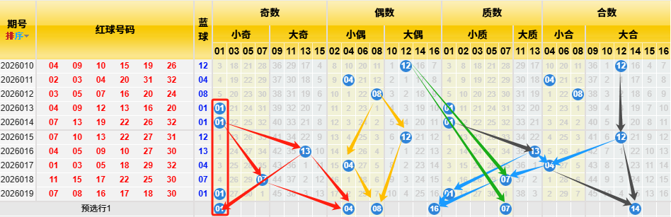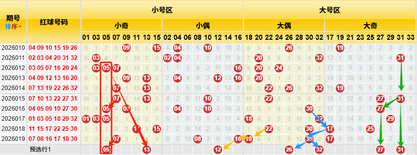 1、小大奇偶交叉图(小奇数红色箭标、小偶数黄色箭标、大偶数蓝色箭标、大奇数绿色箭标)