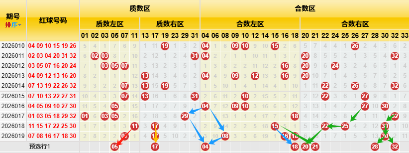 【数据参数】 根据前区质合小大属性,组合成上图质数区1、2、3、5、7、11、13、17、19、23、29、31和合数区4、6、8、9、10、12、14、15、16、18、20、21、22、24、25、26、27、28、30、32、33,质数区分为质数左区1、2、3、5、7、11和质数右区13、17、19、23、29、31;合数区分为合数左区4、6、8、9、10、12、14、15、16、18)和合数右区20、21、22、24、25、26、27、28、30、32、33。