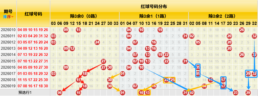 【数据参数】 根据前区除3余数,组合成上图分别为余0路(简称0路)3、6、9、12、15、18、21、24、27、30、33;余1路(简称1路)1、4、7、10、13、16、19、22、25、28、31; 余2路(简称2路)2、5、8、11、14、17、20、23、26、29、32。
