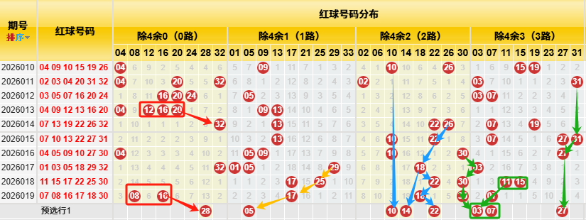 【数据参数】根据前区除4余数,组合成上图分别为余0路(简称0路)4、8、12、16、20、24、28、32);余1路(简称1路)1、5、9、13、17、21、25、29、33;余2路(简称2路)2、6、10、14、18、22、26、30;余3路(简称3路)3、7、11、15、19、23、27、31。