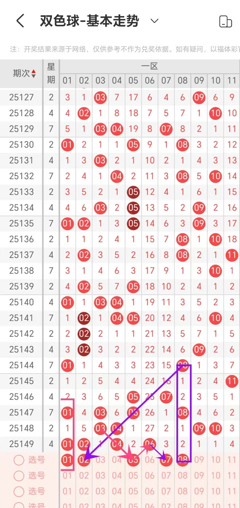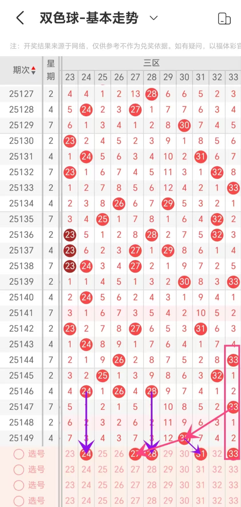 通过对同日期重号出现的数量规律进行统计分析,本期考虑出号0-1个,即10-17-25-26-30-33出号0-1个