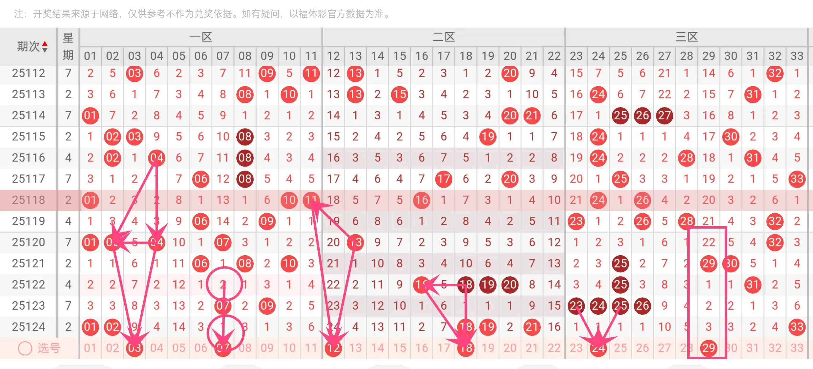 24号:后区重要节点24近期表现异常活跃,已成为后区最具潜力的热点之一。其成功带动了22-25区段的整体温度上升,展现出强大的辐射能力。走势形态分析表明,24号的热度具有较好的持续性,是构建后区组合的核心选择。从组合概率看,24号与29号存在较强的正相关性。
