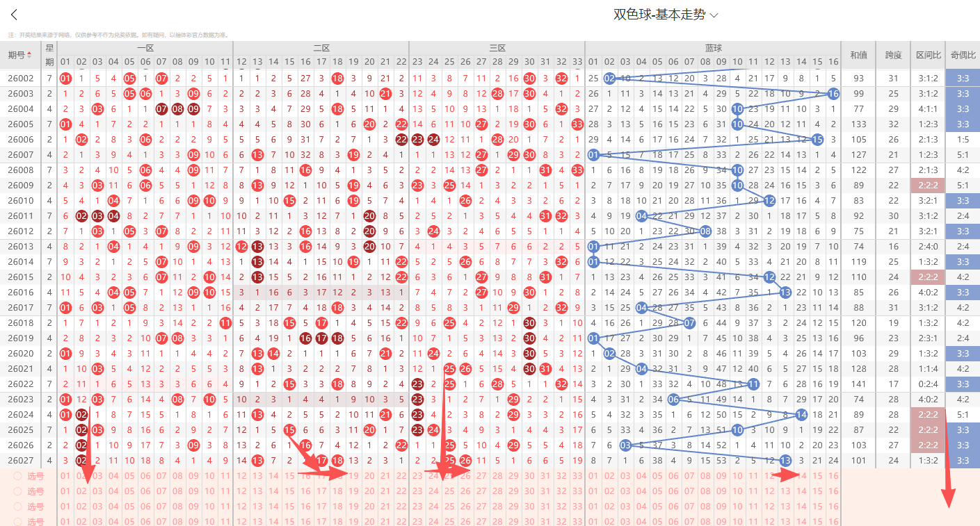 1、红球特征分析:(通过整体走势不难看出每期开奖号都具备以下明显的特征点)
