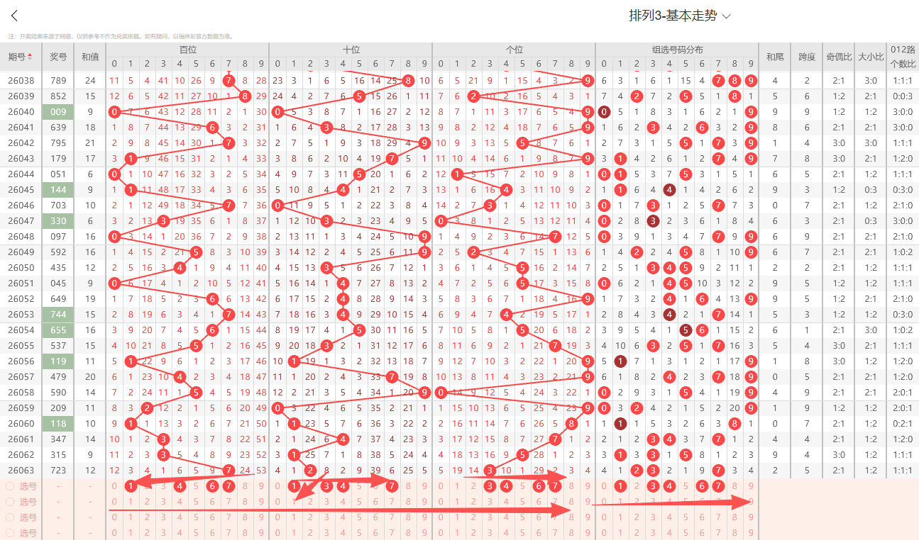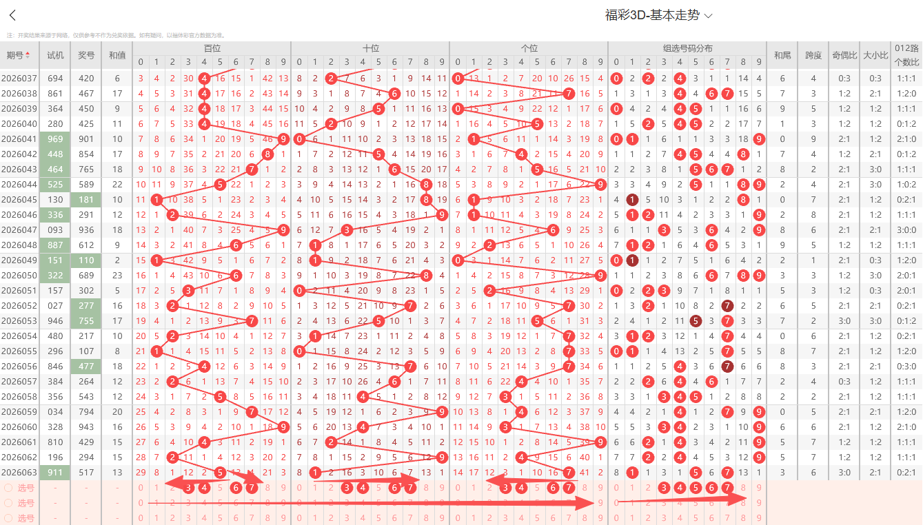 ①百位:上期开出大号奇数7号,在历史开奖记录中显示一般正常的奇偶周期平均在1~3期为普遍现象,奇数连续开出4期上期为1路号码,依据奇偶以及012路周期性规律的转变特征点即本期1路号码有开出的趋势0路号码注意预防
