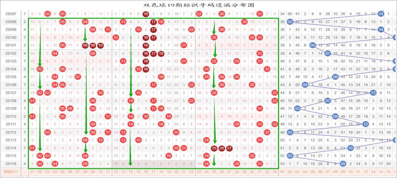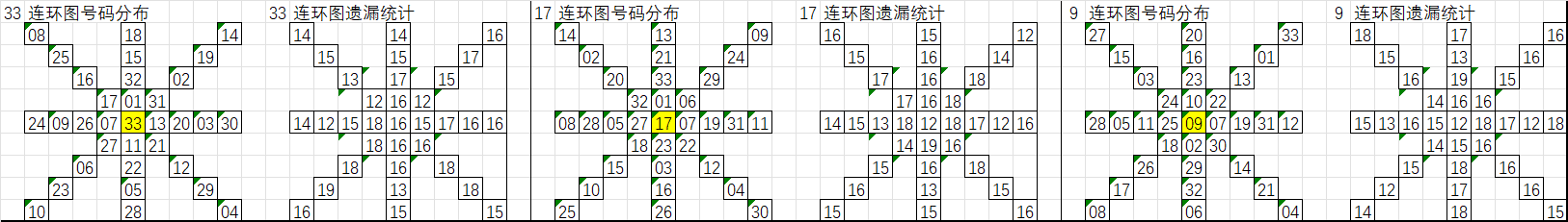 由于数据量大,不一一统计,下图为各个号码分别在33、17、9连环图上的遗漏统计汇总图: