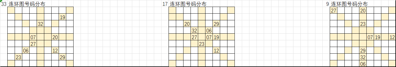 以上是33、17、9的连环图,可以在一起彩平台的九转连环图中查看历期号码分布,以当前期数来看,历史同期共有19期(2003-2023),那么我们就以19期号码来进行遗漏统计,然后把每个号码在近19期的遗漏总数统计出来,分别带入33、17、9的连环图,取出遗漏值大于16的号码,把这些号码在“环上”和“轴上”的相邻号码取出来进行统计,选取出次前15的号码作为大底。