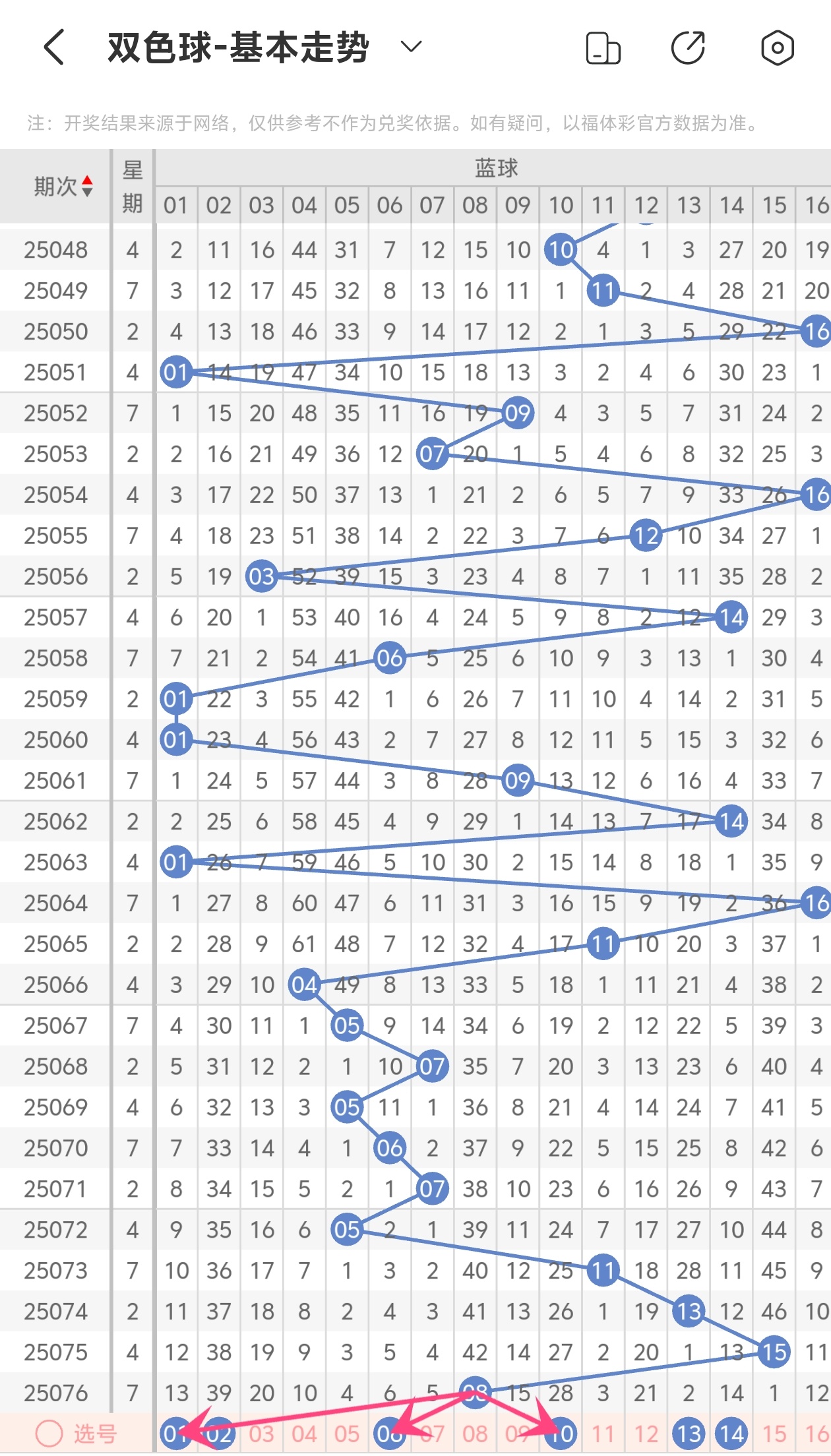 上期蓝球开出08,本期我们可以从上面走势图中看到选号的思路,0路号走完走2路号,本期看好一路号走出,综合以上分析本期蓝球推荐01 02 10 13 14