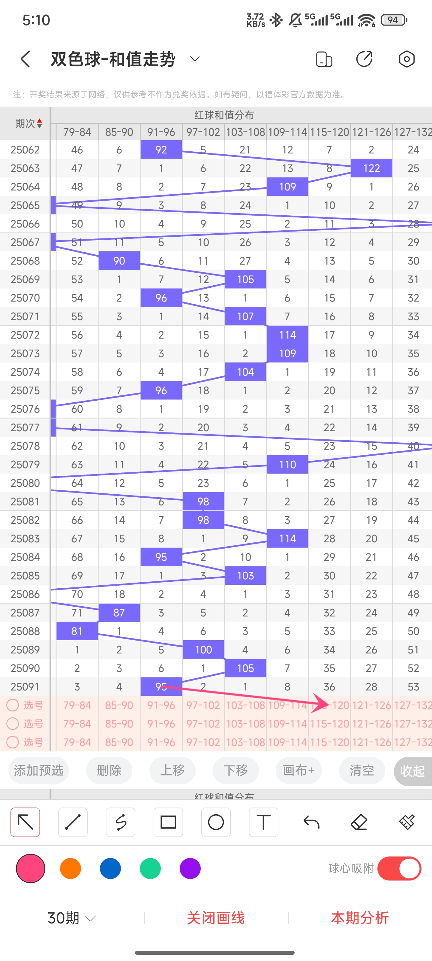 上期和值为95,而近5期和值878110010595均值88上期和值较前一期减少了10,振幅为1095和值也是属于近30期内开出的和值中处于中等的和值,所以目前和值可能继续变大,也可能减少。但通过走势图分析,近几期开出的大和值都是中小和值,所以本期大和值可能会回补。所以推测本期比较大概率会往右上升,和值增大。