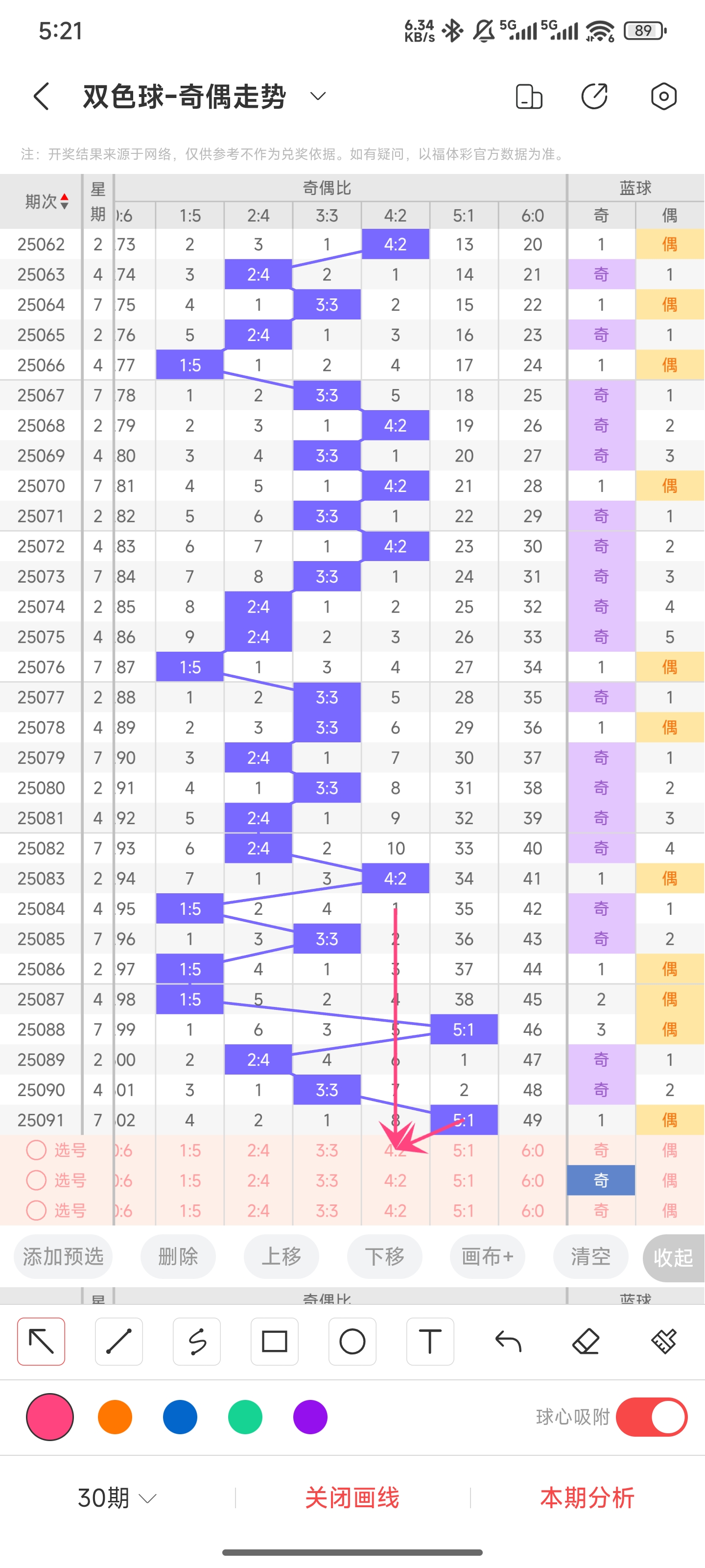 上期奇偶比为5:1,分别为奇偶奇奇奇奇。往前一期奇偶比为3:3。通过近30期内奇偶走势的数据分析,目前1:5奇偶比开出的概率是16.66%5:1奇偶比开出的概率是6.66%3:3奇偶比开出的概率是33.33%4:2奇偶比开出的概率是16.66%2:4奇偶比开出的概率是26.66%,其余类型为0%。因为5:1奇偶比比较难开出,所以一般不会连出,通过走势图可以看到4:2奇偶比已经遗漏8期了,本期有可能会回归。所以推测本期有较大可能是开4:2或者3:3奇偶比,小概率开2:4奇偶比。