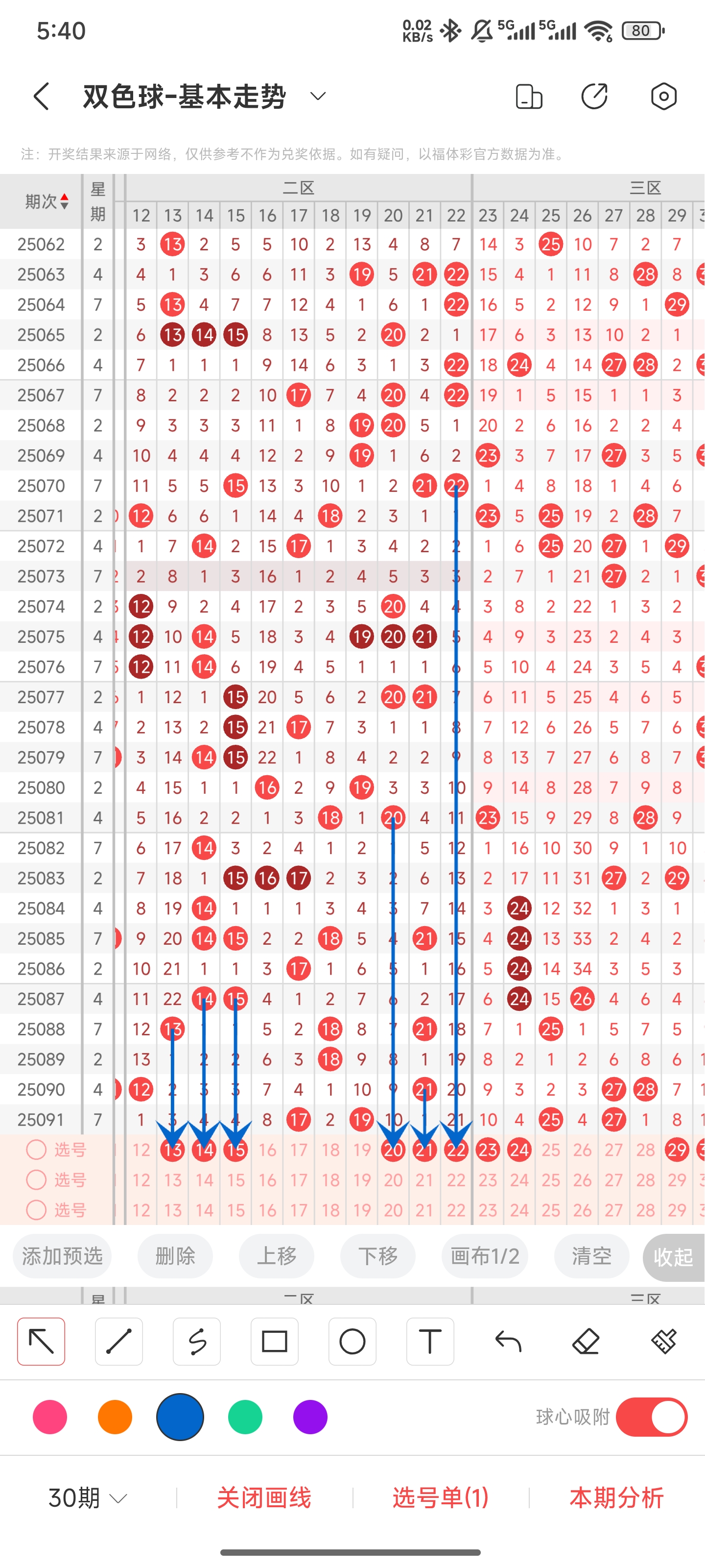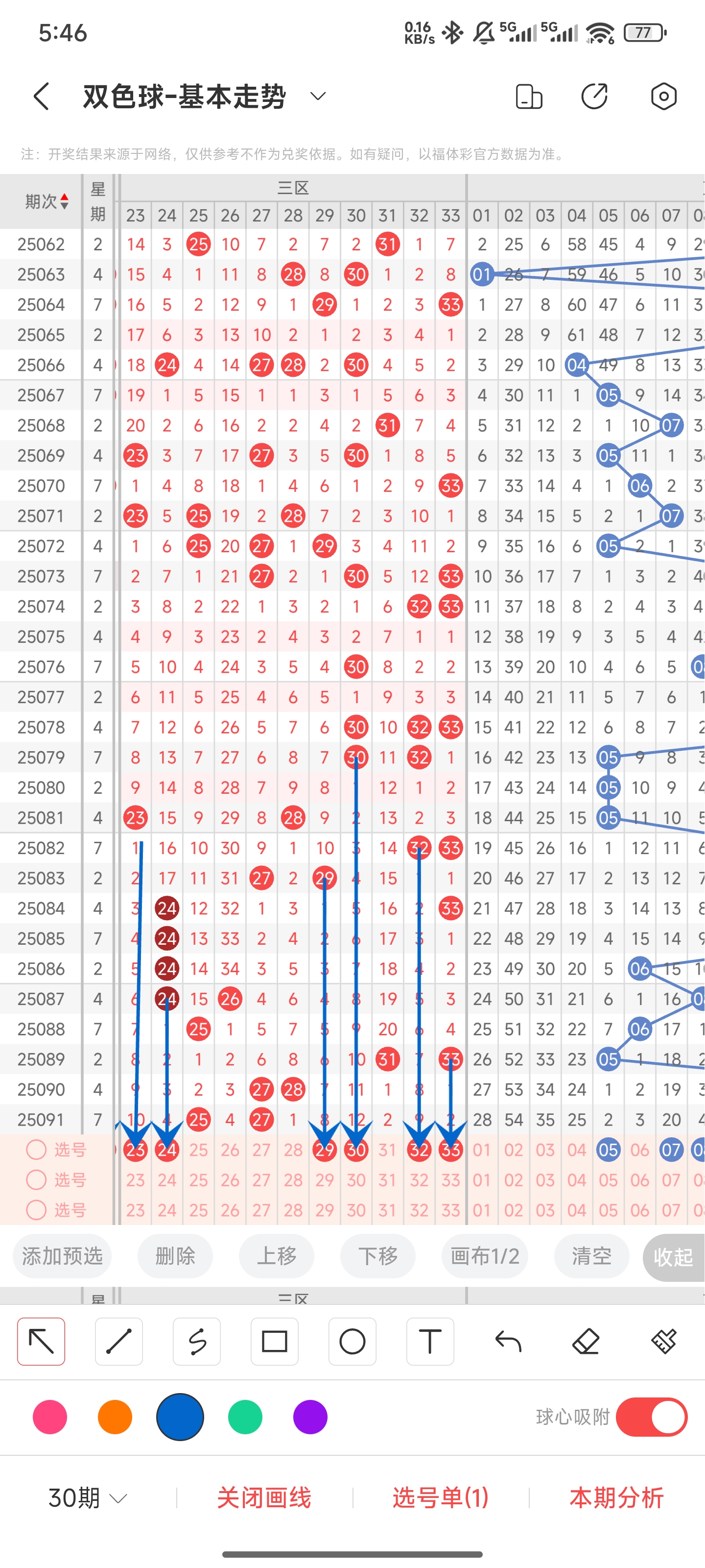 上一期三区开出2527。往前一期开出的是272827已经连出了,所以本期我们不考虑连出,28是冷号,所以也不考虑连出。通过分析走势图,我们可以看出三区最近几期大多数是冷号或者温号回归。所以本期我们可以关注一些遗漏比较久的号码,以及一些热号。因此我们可以关注232429303233。综上所述本期我们推测有可能开出232429303233等号码。
