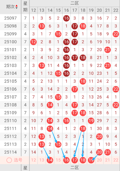 根据走势图可以看出当前区段, 105期开出来18一个号码球,106期开出了17.22二个号码球,107期开出了15一个号码球,108期开出了14.17.22三个号码球,109期开出17.18二个号码球 ,110期开出了14.16.18三个号码球,111期开出了14.18二个号码球,112期开出了13.20二个号码球,113期开出了13.15二个号码球,114期开出了20.21二个号码球,按照如此规律本期当前区可能开出1单或2单1双。我们看下当前区上期没有开出重叠号,那么本期当前区要定重叠号的情况下可关注21号码球。再看下当前区上期没有开出斜连号,当期选号得留意斜连19号码球。本区重点关注14.16.17.18.19