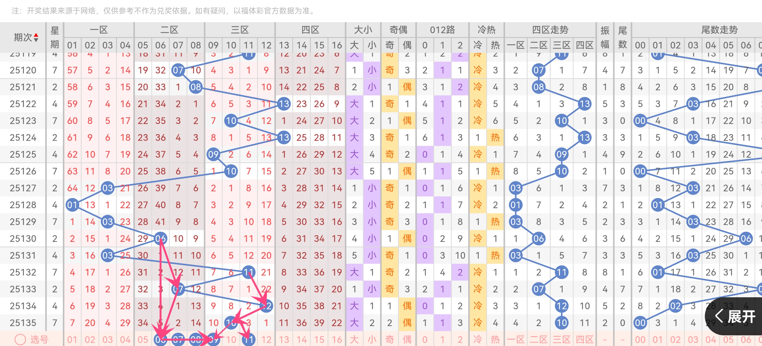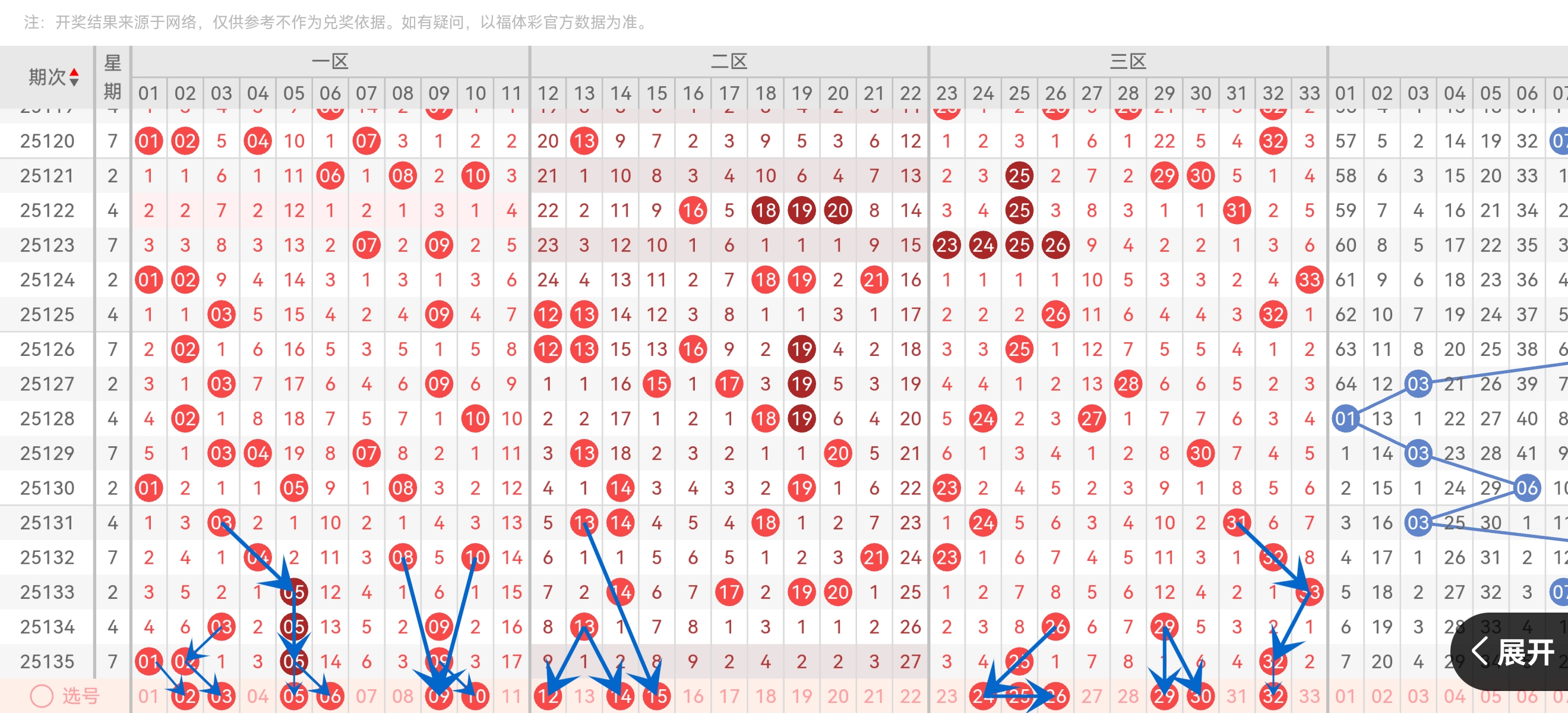 上期回顾(第2025135期) :龙头(第一个红球)开出1路号码01,凤尾(最后一个红球)开出2路号码32。