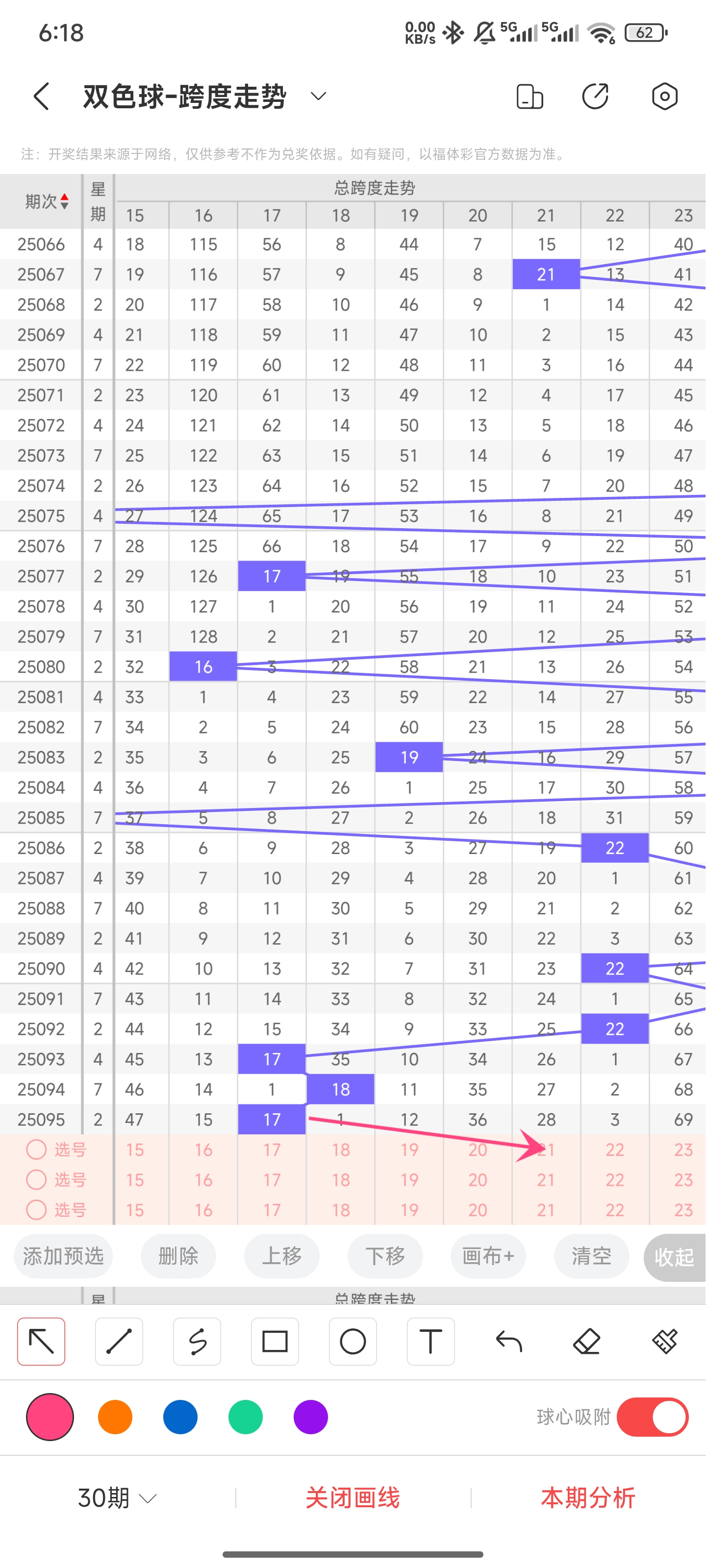 上期龙头为15,凤尾为32,跨度为17,往前一期跨度是18,偏移量为1。近两期的龙头都开的比较大,推测本期龙头应该会有所减小。17跨度值处于30期内开出的跨度值中偏小的位置,通过走势图,可以看到最近几期跨度都比较小,所以本期有比较大的可能性会变大,所以推测本期大概率是往右走的跨度变大,小概率继续往左,跨度变小。