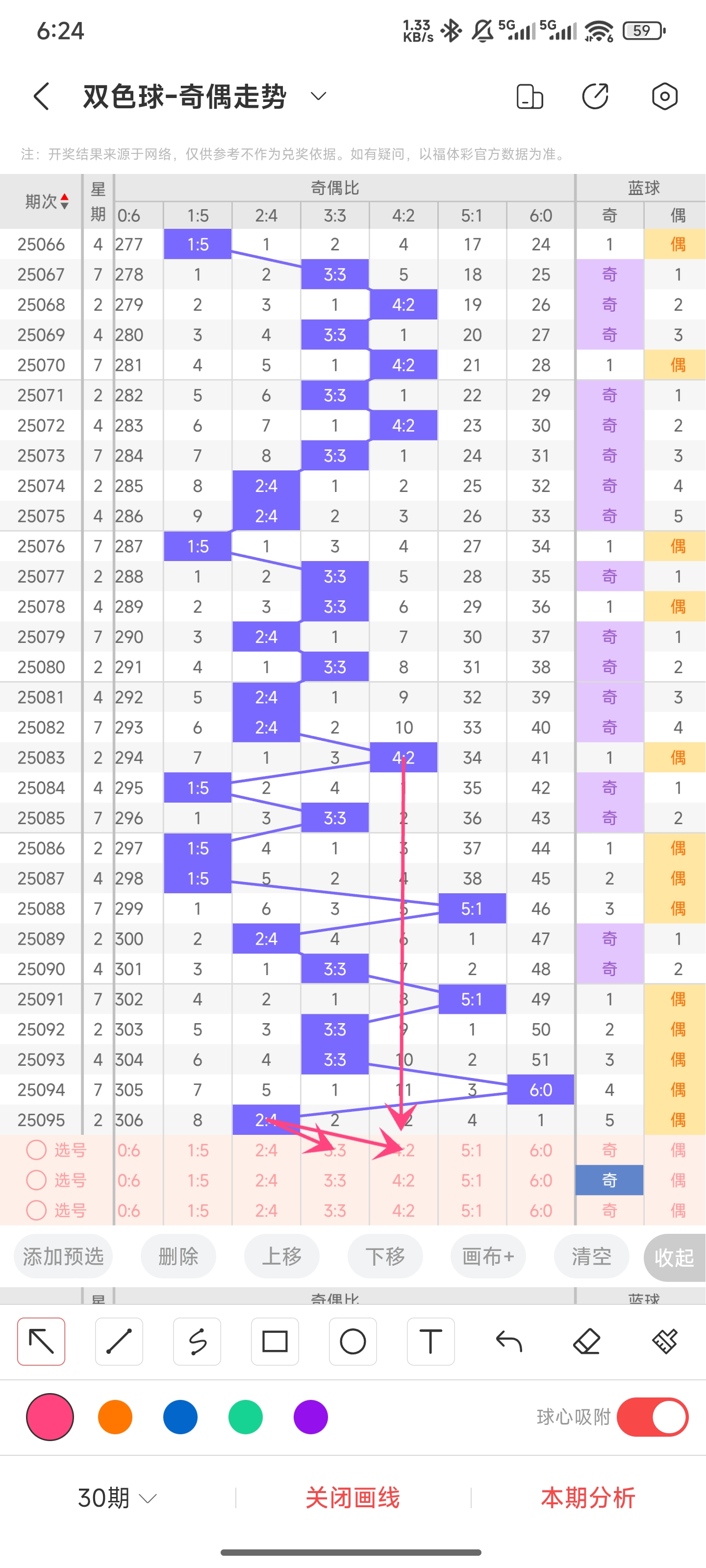 上期奇偶比为2:4,分别为奇偶偶奇偶偶。往前一期奇偶比为6:0。通过近30期内奇偶走势的数据分析,目前1:5奇偶比开出的概率是16.66%5:1奇偶比开出的概率是6.66%3:3奇偶比开出的概率是36.66%4:2奇偶比开出的概率是13.33%2:4奇偶比开出的概率是23.33%6:0奇偶比开出的概率是3.33%。与前一期相比,概率没有发生变化。因为上期开了2:4奇偶比,那么本期有比较大的可能性开3:3或者4:2奇偶比,小概率继续开2:4奇偶比。
