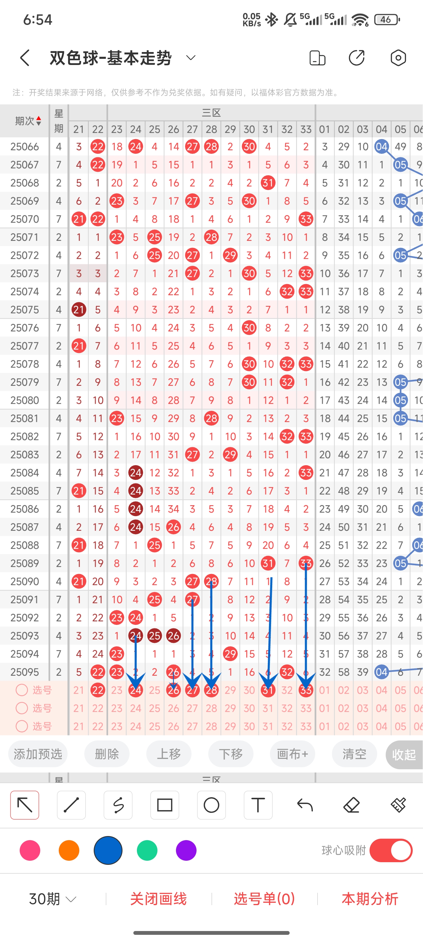 上一期三区开出232632。往前一期开出的是232923已经连续开出了2期,所以本期我们就不考虑连出,26可以防一手冷号连出。通过分析走势图,最近三区开出的号码也是比较多的,推测本期有可能减少。结合遗漏期数和冷热号,本期我们可以关注一下,最近没有怎么开出的号码,例如27283133,除此之外,我们再关注一下比较热门的24号球。综上所述本期我们推测有可能开出242627283133等号码。