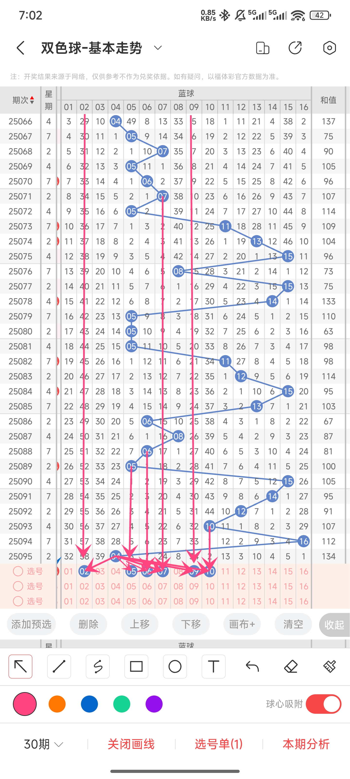 上期开出的是04,往前一期开出的是16。趋势是往左偏移,偏移了12个点,走势很陡。04是冷号回归,且是一个非常冷门的号码,本期不考虑连出的可能性,通过分析目前蓝球的走势图,最近两期开出的号码都是遗漏比较久的冷号,有继续开冷号的可能性。目前趋势是比较大的可能性往右的,小概率继续往左。推测走势应该也不会太陡,所以本期我们可以关注020506070910等号。综上所述本期推测可能开出020506070910等号码。