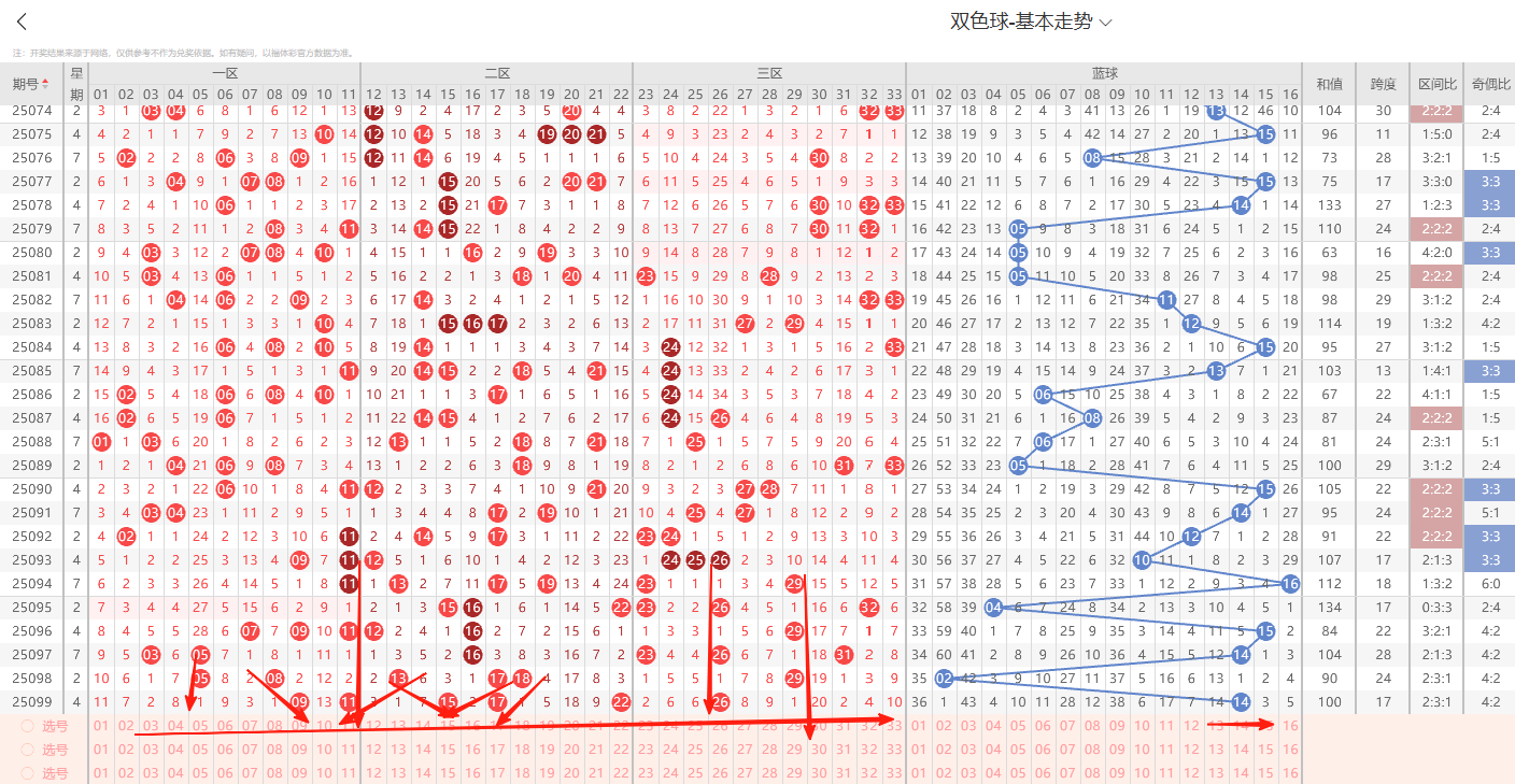 1、红球特征分析:(通过整体走势不难看出每期开奖号都具备以下明显的特征点)