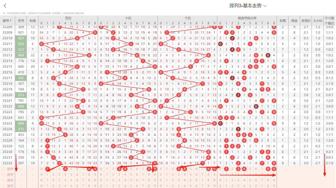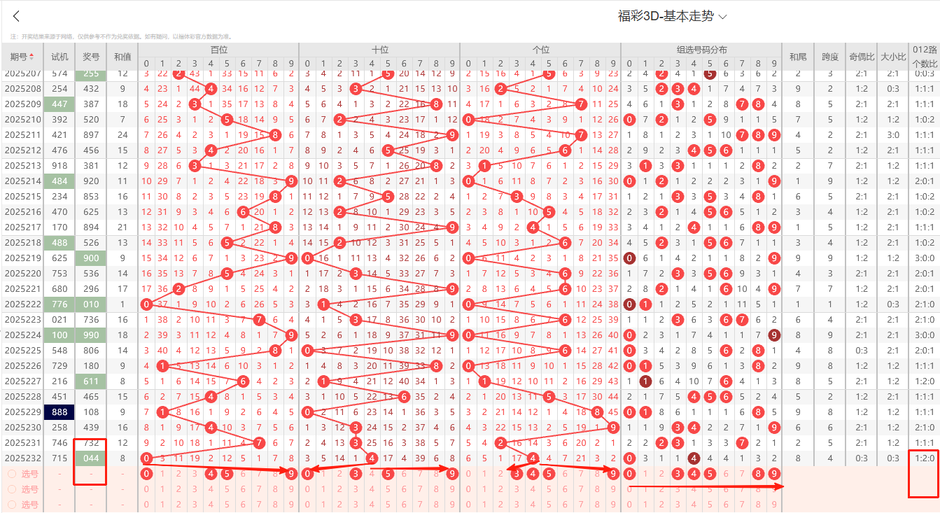 ①百位:上期开出小号奇数3号,在历史开奖记录中显示一般正常的奇偶周期平均在1~3期为普遍现象,上期出现奇偶互变为奇数0路号码,依据奇偶以及012路周期性规律的转变特征点即本期0路号码有开出的趋势2路号码注意预防